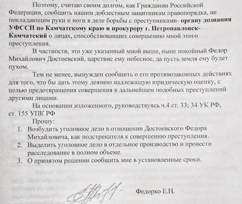 Федорко полагал, что, прочитав этот текст, судебные приставы осознают абсурд ситуации и прекратят заниматься ерундой. Но те юмора не поняли. Заместитель начальника Петропавловск-Камчатского городского отдела судебных приставов И. Ли на полном серьезе принял это заявление, зарегистрировал, присвоил ему номер и приобщил к материалам уголовного дела. В отношении Достоевского натурально проведена проверка по признакам состава преступлений, предусмотренных ч. 4 ст. 33 (подстрекательство) и ч. 1 ст. 297 УК РФ (неуважение к суду).
