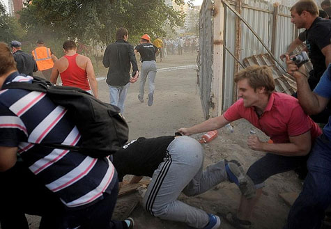 Когда количество протестующих превысило число охраны, с криками, бросанием камней, арматуры, палок, люди бросились на спортсменов. Последние активных действий не предпринимали – они пятились спиной к оставшейся секции забора.