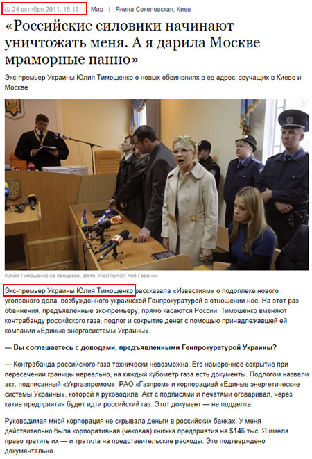 Российская газета Известия опубликовала интервью Юлии Тимошенко десятилетней давности под видом свежего материала. Так, в понедельник, 24 октября, в газете вышел материал журналистки Янины Соколовской под заголовком "Юлия Тимошенко: Российские силовики начинают уничтожать меня. А я дарила Москве мраморные панно".