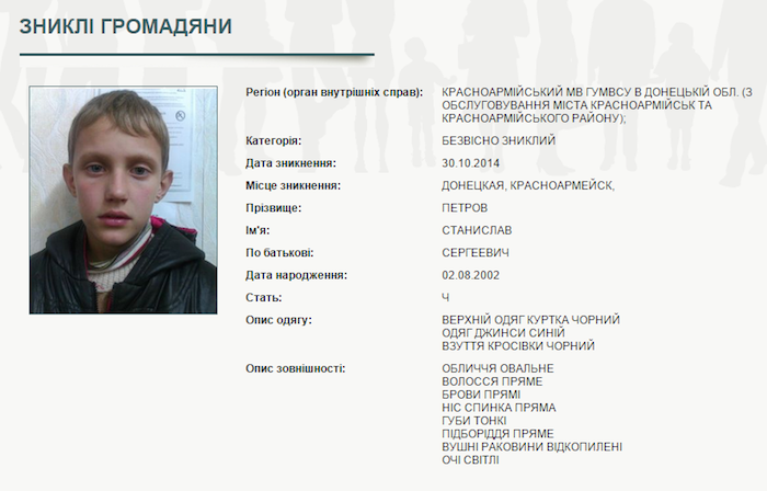 В ориентировке Красноармейского ГУМВД Украины в Донецкой области сообщается, что у мальчика "легкая степень умственной отсталости" и он склонен к бродяжничеству.