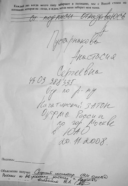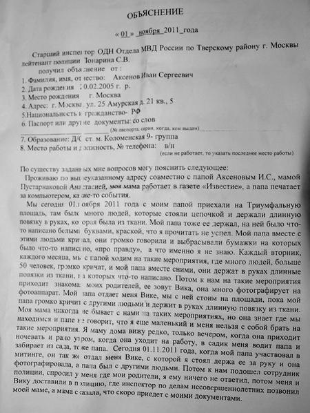 При этом, согласно документу, шестилетний Иван начал разговор с полицейскими словами: "По существу заданных мне вопросов могу пояснить следующее". Ребенок пояснил, что каждый вторник ходит с папой на Триумфальную площадь. "Мой папа вместе с другими людьми громко кричит, держит длинную повязку из ткани и разбрасывает бумажки про правду, а что именно, я не знаю",— рассказал полицейским Иван Аксенов. По его словам, сам он в это время стоит далеко от площади с Викторией. "Каждый раз, когда моего папу забирают в полицию, мы с Викой стоим на площадке, которая на улице, и ждем, когда меня заберет моя мама",— закончил Иван. Позже полицейские вызвали его мать, которой и передали ребенка. Викторию Кузнецову полицейские отправили на обследование в 21-ю больницу, а потом в центр временного содержания несовершеннолетних, откуда ее 2 ноября забрали родственники.