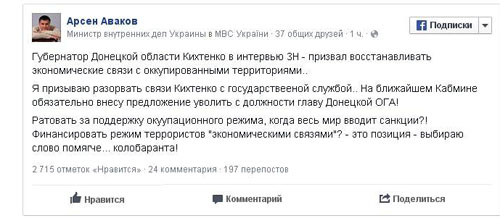 "Губернатор Донецкой области Кихтенко в интервью "ЗН" - призвал восстанавливать экономические связи с оккупированными территориями... Я призываю разорвать связи Кихтенко с государственной службой... На ближайшем Кабмине обязательно внесу предложение уволить с должности главу Донецкой ОГА", - написал Аваков.