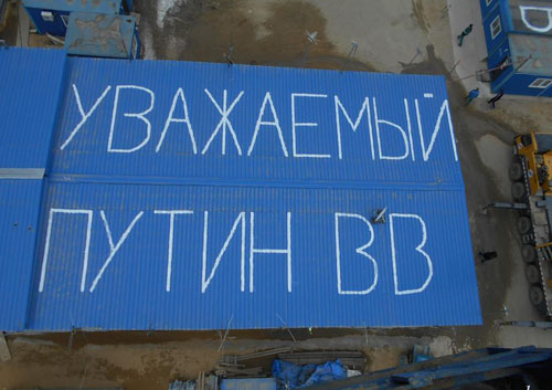 На бытовках белой краской сделана следующая надпись: «Уважаемый Путин В.В. 4 месяца без зарплаты. Хотим работать. Спаси рабочих».