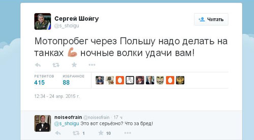 "Мотопробег через Польшу надо делать на танках. «Ночные волки» удачи вам!", – без обиняков отметил Сергей Шойгу в своем микроблоге Twitter.
