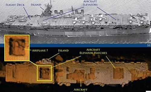 Зараженный радиацией корабль нашел и исследовал автономный подводный аппарат "Эхо Рейнджер", сконструированный компанией Boeing и оснащенный выдающим трехмерные изображения сонаром Echoscope. В докладе ученых отмечается, что авианосец стоит на ровном киле, а его полетная палуба осталась практически неповрежденной.