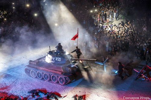На сцене также инсценировали советские времена, эпизоды из индустриализации, военных лет, выступали «пионеры», «рабочий и колхозница». Также звучали гимны России и Советского Союза.