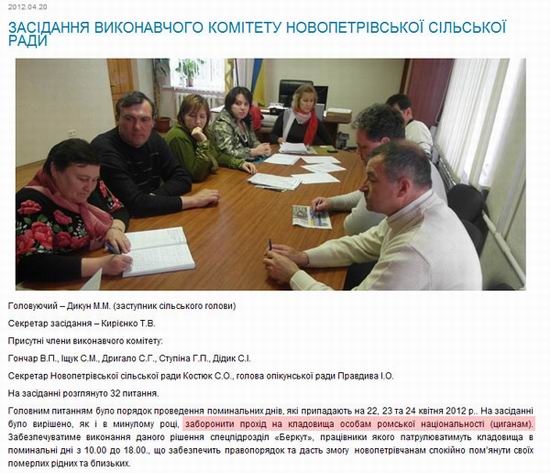 В селе Новые Петровцы Киевской области запретили проход на кладбище лицам цыганской национальности. Соответствующее решение было рассмотрено на заседании исполнительного комитета Новопетровского сельсовета, - сообщает «Украинская правда» со ссылкой на сайт сельсовета.