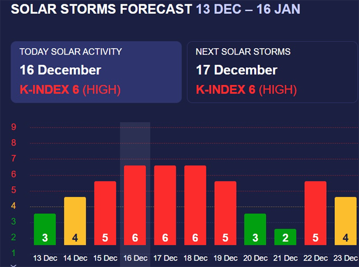 За даними сайту Meteoagent, 15 грудня К-індекс сягав 5 балів, а вже протягом 16-18 грудня він перевищує 6 балів. З 19 грудня бурі припиняться, але вже з 22 числа знову очікується потужний спалах у 5 балів.