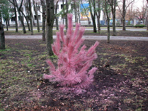 Со вчерашнего дня, свежевысаженные молодые сосны в Сквере героев Краматорска привлекают всеобщее внимание ярко-розовым цветом.