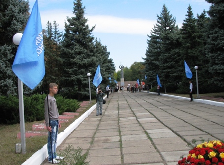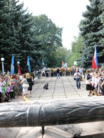 И вот, на фоне всего этого, регионалы решили попиариться. Всем прибывшим на митинг вручалась газетка с рассказами о том, какая нехорошая дама Юлия Тимошенко, а вся центральная аллея мемориального комплекса была заставлена юными истуканчиками, вздымавшими в небо удочки с прицепленными флагами Партии регионов. Так же плотно голубела флагами и толпа школьников и студентов. Слава Богу, обошлось без портрета Лидера…