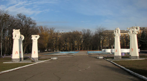 Ожидаемое - случилось: в ночь на 10 декабря неизвестные выродки испоганили надписями скульптурную композицию "Ворота. Лабиринт", совсем недавно установленную в центре Краматорска, у фонтана.