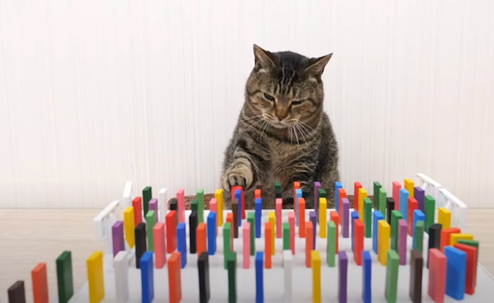 Блогер выстроил чудо-конструкции из домино и пригласил своих кошек все разрушить.
