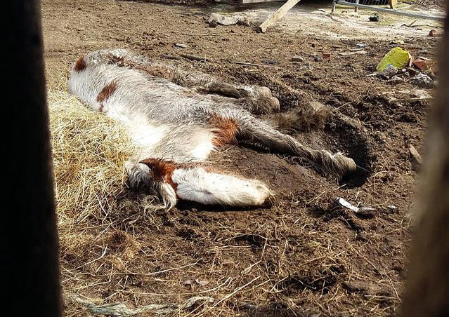 Волонтеры спасли жизнь лошади, которая лежала полумертвой: она была обезвожена, истощенная и грязная.