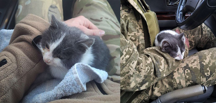 57-річний чоловік перебуває на фронті від початку повномасштабного вторгнення. Чоловік розповів, що котика везли до Києва у переносці. Потім він взяв тварину на руки, а сам заснув. У той момент Христина Бондаренко і зробили фото.