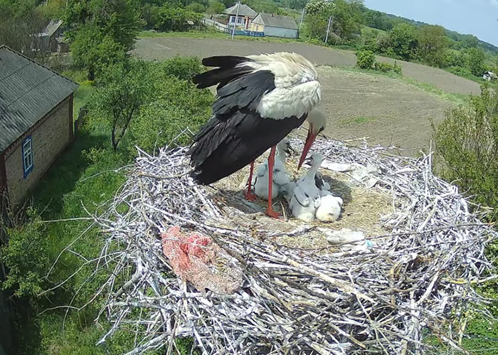 У березні цього року камеру таки запустили. І 31 березня у гнізді, куди Грицько з Одаркою повернулися, з’явилося перше яйце. А потім — ще чотири, кожне через ніч. І пташенята також вилуплювалися не всі разом, а також по черзі — з 5 травня. Їм імен ще не дали, бо ніяк розрізняти. «От коли окільцюємо — тоді», — кажуть науковці.