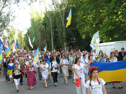 По традиции, главным событием праздника стала "хода" - патриотическое шествие по центральным улицам Краматорска, присоединиться к которому могли все желающие.