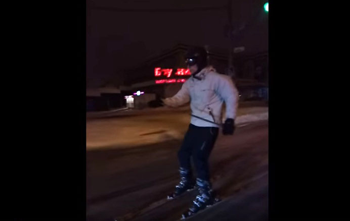 Видео датировано 17-м января. Лыжник проехался по центральным районам города и микрорайону "Лазурный", причем, судя по пояснительным титрам, скорость его движения достигала 60 километров в час.