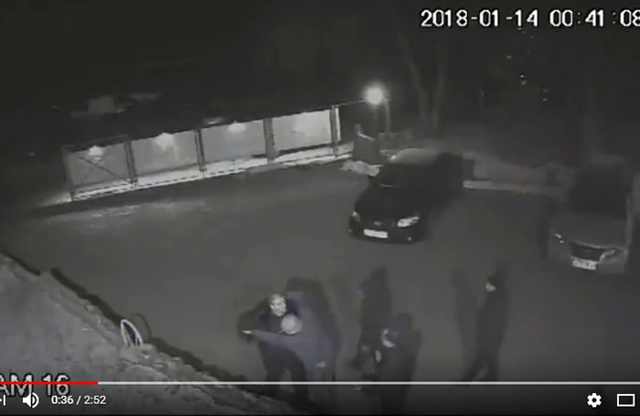Видео, снятое камерой наружного наблюдения автостоянки, дает представление о том, что четверо мужчин имеют какие-то претензии к пятому (по всей видимости, это и есть подозреваемый). В какой-то момент последний вытаскивает из кармана предмет (по всей видимости, оружие), другие пытаются этот предмет отобрать. Затем все перемещаются в угол автостоянки, после чего, по всей видимости, происходит выстрел, и несколько человек резко отскакивают, но затем начинают кого-то избивать. В итоге, один из мужчин перелазит через забор и убегает.