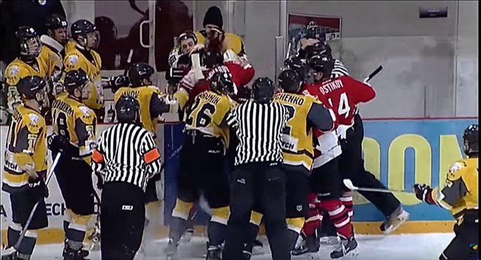 В третьем периоде матча регулярного чемпионата Украины по хоккею, в котором донецкий "Донбасс" в Дружковке обыграл белоцерковский "Белый Барс" (7:3), произошла массовая драка.