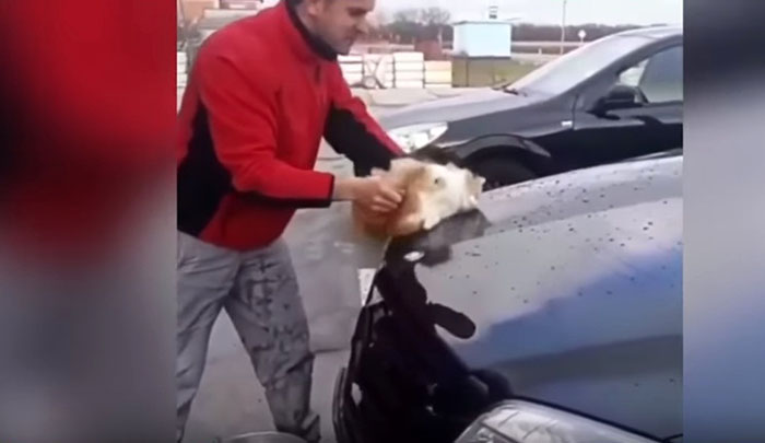 На видео, которое снимал знакомый живодера, видно, как мужчина окунает кошку в ведро с водой, а затем моет ею капот и фары автомобиля. Двуногие участники видео при этом радостно хихикают.