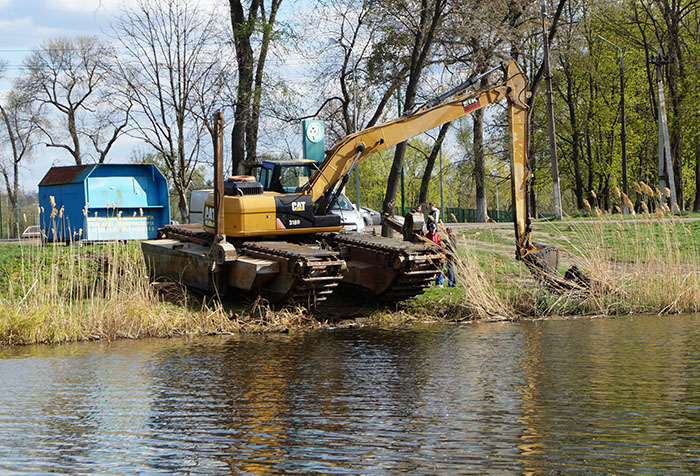 В Краматорске осваивает будущий фронт работ специальный экскаватор-амфибия, который прибыл в город для расчистки русел рек Казенный Торец и 2-я Беленькая. В обозримом будущем здесь появится городская набережная, но сейчас нужно выполнить объемную работу по расчистке и углублению речек.