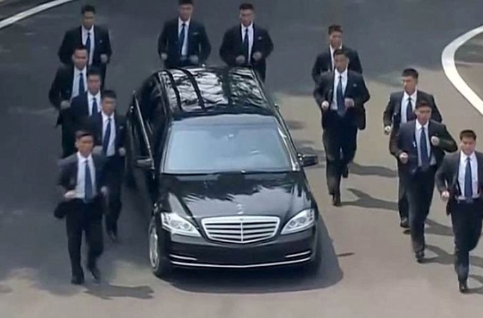 Лимузин с корейским вождем бегом сопровождала группа молодых мужчин.