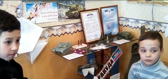 В кадр попали школьники из 2 класса, они заявили, что "ополченцы" "ДНР" - это "освободители" Донбасса, которые "не стреляют" по детям и беззащитному населению, а бойцы ВСУ - это "фашисты", которые хотят "захватить их родную землю".