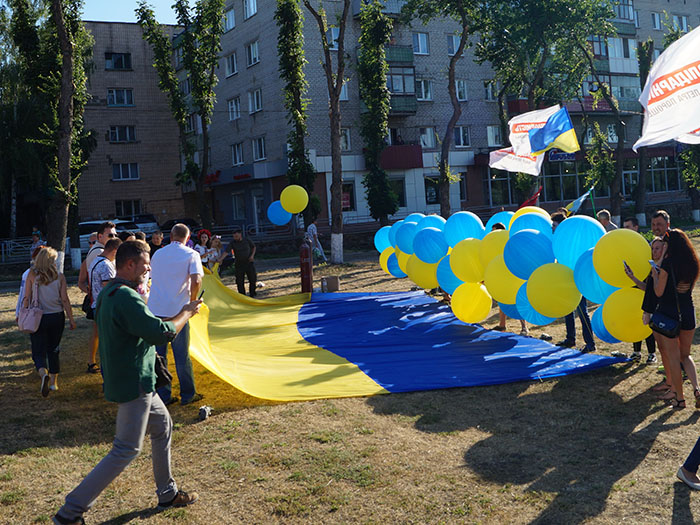 Краматорчан ожидал сюрприз от членов городской организации "БПП "Солидарность", которые запустили в небо на воздушных шарах флаг Украины размерами 10х6 метров.
