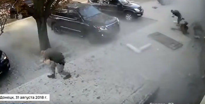 На кадрах видно, как к кафе подъезжает кортеж Захарченко, боевик в сопровождении телохранителей покидает авто и идет в заведение. Первым в кафе заходит его охранник и осматривается. Следом идет главарь "ДНР", взрыв прогремел, как только он зашел в предбанник кафе.