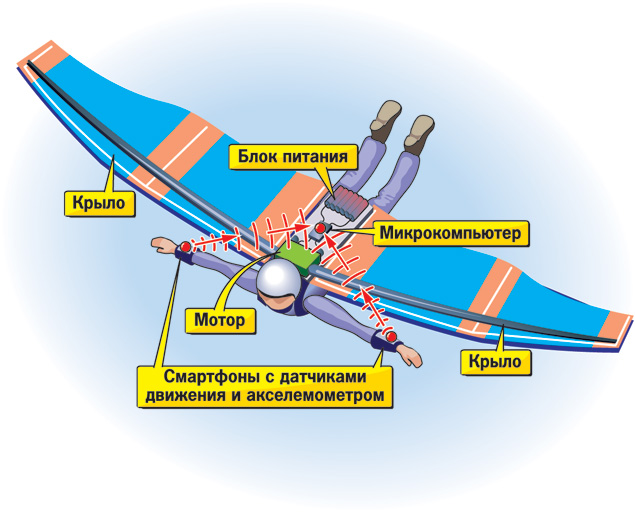 Вся конструкция держится на каркасе из авиационного алюминия, на котором установлены два бесщеточных двигателя. Электронную начинку, которая управляет двигателями и считывает параметры полета, Ярно взял из отдельных деталей ?смартфонов Android и приставки Nintendo Wii.? На сайте его проекта, который он назвал Human Bird Wings,? можно подробно ознакомиться с чертежами и механизмом действия.