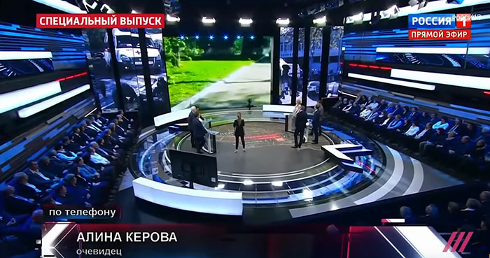 Девушка, которую ведущая Скабеева представила как Алину Керову, рассказала о событиях в колледже, об очередности взрывов и панике среди студентов. .
