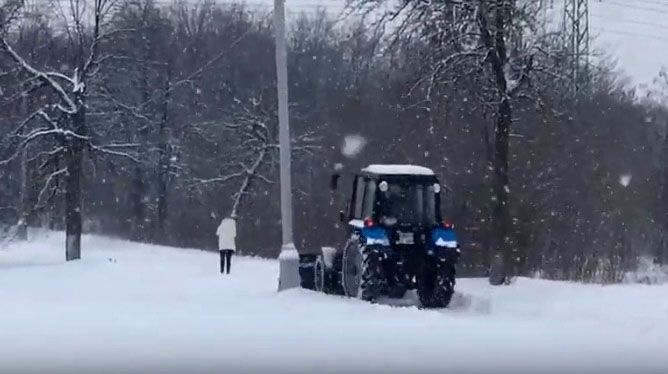 Краматорск основательно засыпало снегом. "И вот снегоуборочный трактор его чистил, - комментирует видео автор. - Направлялся вверх к площади по проспекту Мира, пока он разворачивался, перед прошла девушка. Он посигналил, она пошла быстрее. Но не пропустила, он проехал пару метров ещё раз посигналил - она не сошла. Потом водитель трактора вылез из кабины, они немного поругались И стоял трактор на месте, пока девушка не дошла до верха проспекта Мира и не свернула по своим делам. Тогда трактор продолжил уборку.