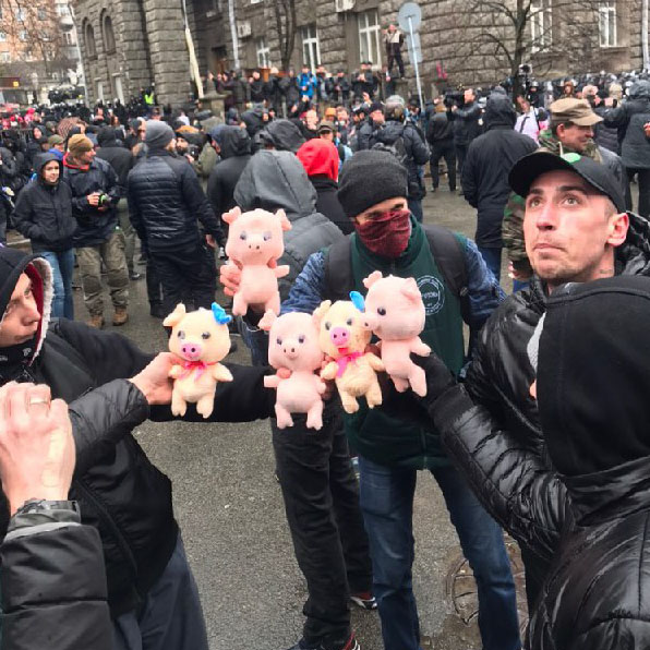 Сегодня, 16 марта, в Киеве сторонники "Национального корпуса" провели митинг на Майдане Независимости, после чего прошли маршем к Кабинету министров и Верховной Раде. Финальной точкой марша стала Администрация Президента, где участники акции стали бросать к зданию АП сотни мягких игрушечных поросят, скандируя "Свинарчуков за решетку".