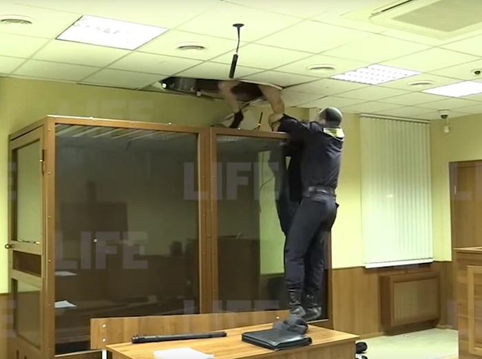 В Москве Леонид Грейсер, которого в суде обвиняют в том, что он зарезал свою сестру и исписал её тело ритуальными символами, попытался сбежать из клетки в зале суда через потолок.