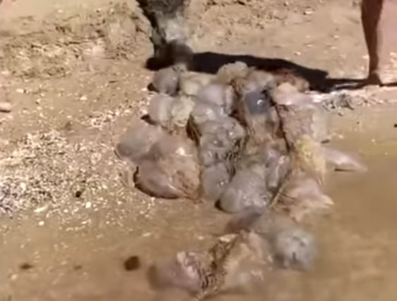 Опубликовано видео, на котором показано, как отдыхающие в Кирилловке вытаскивают медуз из моря рыболовными сетями.