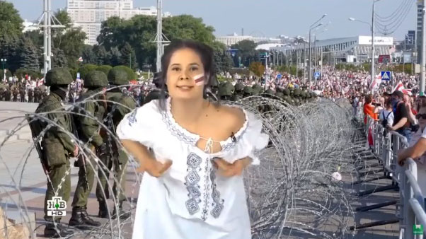 По сценарию, на связь с ведущим вышла "участница протестных акций" — "раздраженная белорусская горожанка", которую изображала московская актриса Екатерина Шмакова.