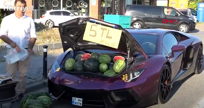 Даже продав весь товар (на вид там около 150 кг арбузов), выручка продавца составила бы около 90 долларов. Стоимость суперкара Lamborghini Aventador на вторичном рынке колеблется от 150 000 до 400 000 долларов.