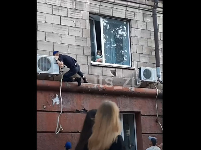В Запорожье нацгвардейцы спасли маленькую девочку, которая вылезла в окно второго этажа и могла упасть. Один из бойцов, при содействии своих товарищей, влез на карниз второго этажа, подобрался к окну и предотвратил трагедию.