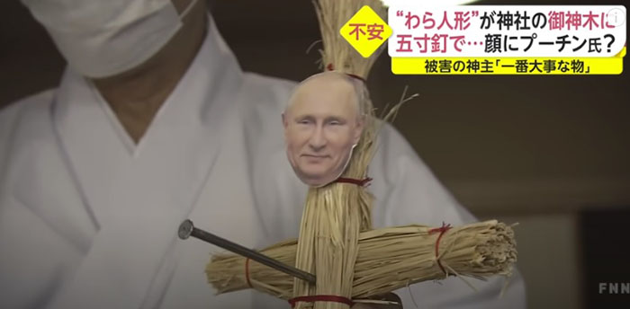 В пригороде Токио стали находить ритуальных соломенных кукол - вара нингё - с портретами президента РФ Владимира Путина. Подобные куклы вуду были найдены прибитыми к деревьям на территории семи храмов в городе Мацудо.