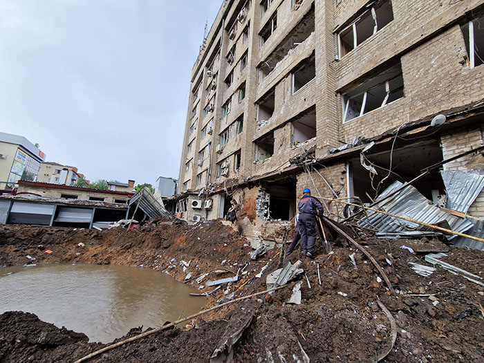 Руйнування вражають: у будівлі винесло всі вікна і двері, а люди дивом вижили. Одна жінка отримала поранення. На парковці у внутрішньому дворі величезна воронка від ракети.
