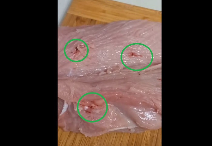"Ми купляємо харчі для підприємства, нас два рази дурять - на вагах і на наколках.." - коментує підприємиця своє відео, на якому можна побачити сліди стороннього втручання на шматку філе індички. Це - відомий злодійський прийом, коли для збільшення ваги продавці вводять у м'ясо воду, яка при заморожуванні "обтяжує" товар.