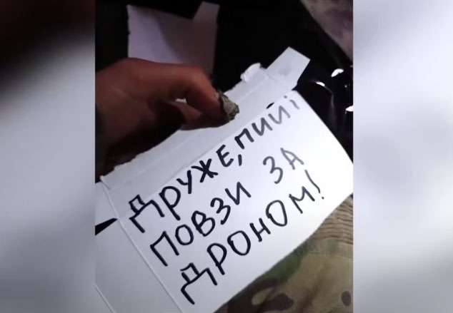 "Друже, пий і повзи за дроном", - таке послання разом з гарячим чаєм скинули з дрона пораненому військовослужбовцю Луганського прикордонного загону аеророзвідники 68-ї окремої єгерської бригади ім. Олекси Довбуша", - написав Лисогор.