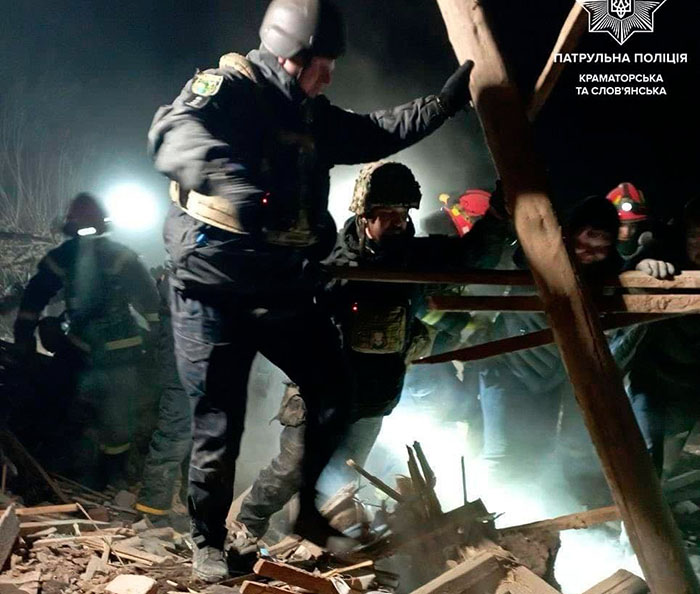 Прес-служба, БПП в м. Краматорськ та Слов'янськ опублікувала відео с з бодікамер патрульних поліцейськіх, які разом з іншими спеціальними службами та місцевими мешканцями намагалися врятувати людей з-під завалів після обстрілу 17 лютого.