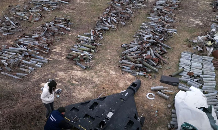 Більшість снарядів тут — це залишки від РСЗВ: «гради», «урагани» та «смерчі», а також залишки балістичних і крилатих ракет, С-300 і цілий «шахед», який сам упав у полі. Після обстрілів прокурори оглядають і збирають залишки від ракет чи снарядів. Усе це навмисно зберігають для доказів воєнних злочинів у міжнародному суді.