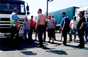 Во время визита президента Виктора Януковича в Днепропетровск во вторник в одной из пробок разгневанные дальнобойщики набросились на ГАИшника, который своим телом перекрыл движение грузовым автомобилям.