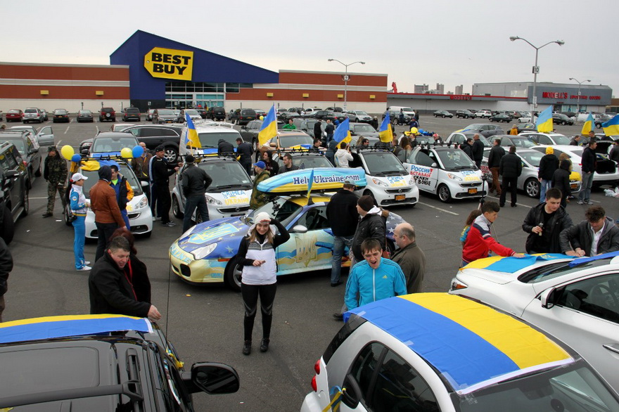 "Вчера с 10:00 до 18:00 ездили по Нью-Йорку, собрали 250 машин. Полиция одобрила маршрут из Бруклина в Манхэттен (посольство Украины, посольство России, ООН и центральные улицы города, там, где находится большинство информ. агентств). Поскольку колонна вышла очень большая, а в городе короткие промежутки между светофорами, то все в одну шеренгу не поместились, поэтому ехали по маршруту по 10 машин, в конце каждого десятка ехал "связной с рацией" и координировал остальных. Если кто-то проехал перекресток и за ним загорелся красный свет, то все останавливались на следующем перекрестке и ждали остальных. Из-за этого постоянно были отставшие.