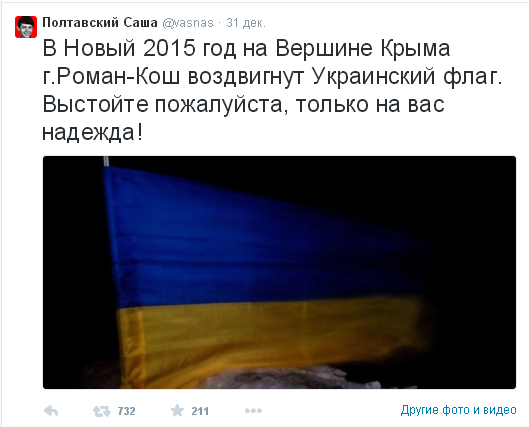Гражданин России Александр Полтавский в новогоднюю ночь установил украинский флаг на наивысшей точке аннексированного Крыма - вершине Роман-Кош.