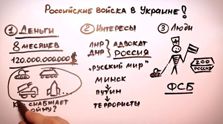 По самым скромным и приблизительным подсчетам, цена восьми месяцев войны на Донбассе составила 120 000 000 000 долларов. Такие деньги "ополченцам" могла предоставить только Россия, которая является единственным "защитником" боевиков. На переговорах в Минске выгодные условия для боевиков Донбасса выторговывал лично президент РФ. Участие граждан России в этой войне не скрывает даже Путин, стыдливо называя их «бывшими трактористов и шахтерами". Объяснением присутствия российской армии на Донбассе есть интересы РФ в регионе. При этом офицеры регулярной армии и ФСБ РФ являются стержнем, на котором держатся боевики. Именно офицеры с РФ контролируют расходы российских денег на Донбассе. В конце ролика авторы видео резюмируют, что на протяжении всей истории агрессивная война всегда заканчивается в столице страны-агрессора.