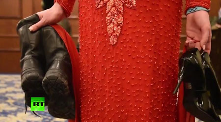 Дамы продефилировали в вечерних платьях от донецкого дизайнера Юноны Цереры, а затем вышли на сцену в более привычной для них военной форме.