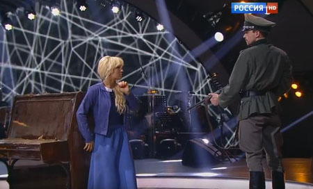 По федеральному каналу "Россия-1" показали номер, где немецкий офицер танцует с недобитой им подпольщицей. Провокационная музыкальная композиция была продемонстрирована в рамках шоу "Танцы со звездами" телеканалом "Россия".